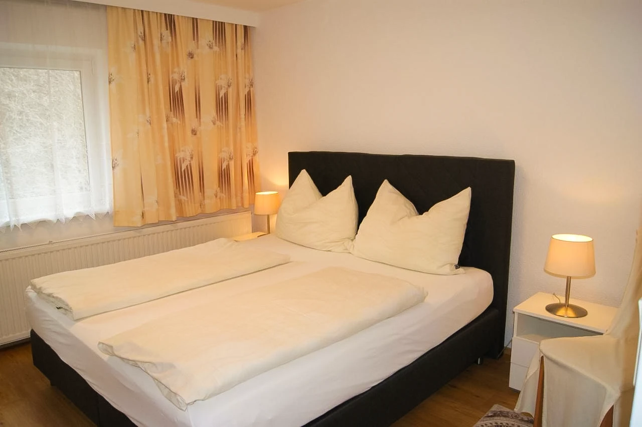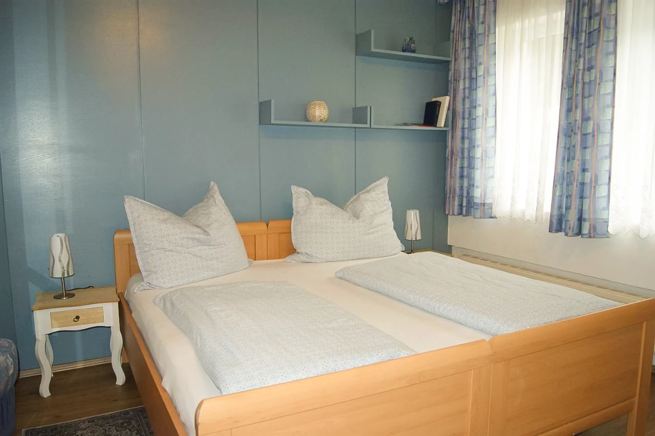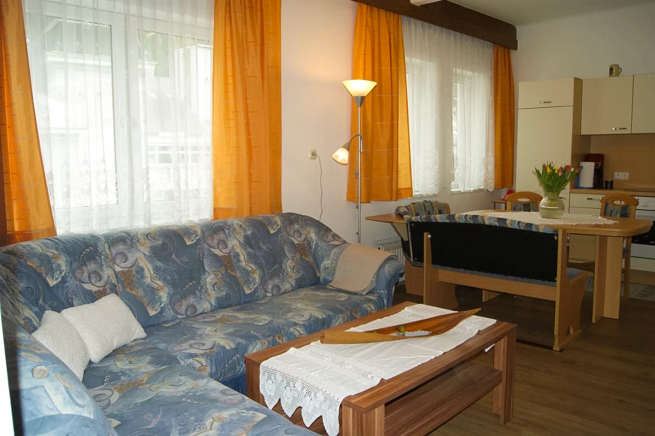 Das Apartment 1 liegt im ersten Obergeschoss, ist ausgestattet mit einem großen Schlafzimmer, einer Wohnküche mit ausziehbarer Couch, Badezimmer und einem extra WC. Es bietet Platz für vier Personen.