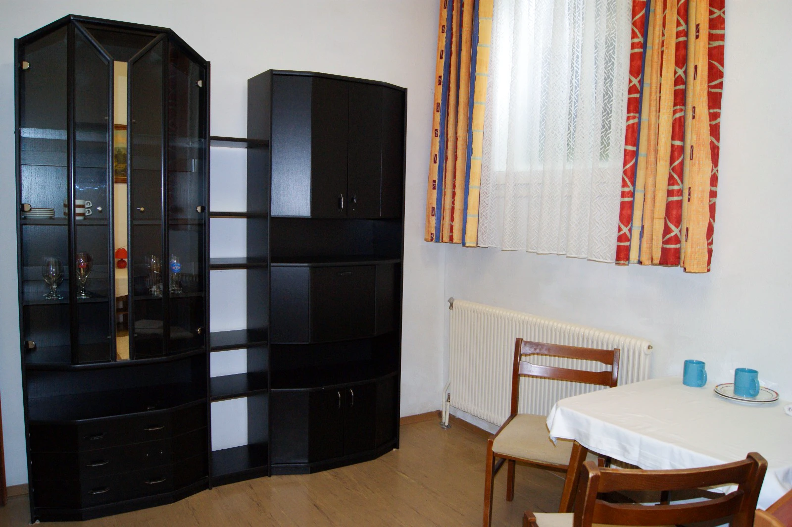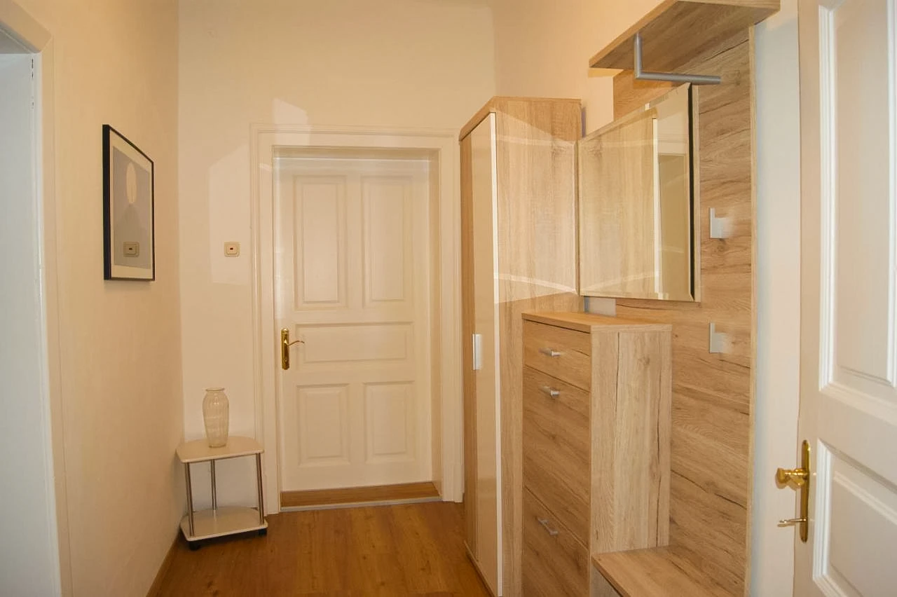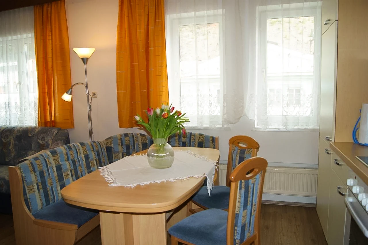 Das Apartment 1 liegt im ersten Obergeschoss, ist ausgestattet mit einem großen Schlafzimmer, einer Wohnküche mit ausziehbarer Couch, Badezimmer und einem extra WC. Es bietet Platz für vier Personen.
