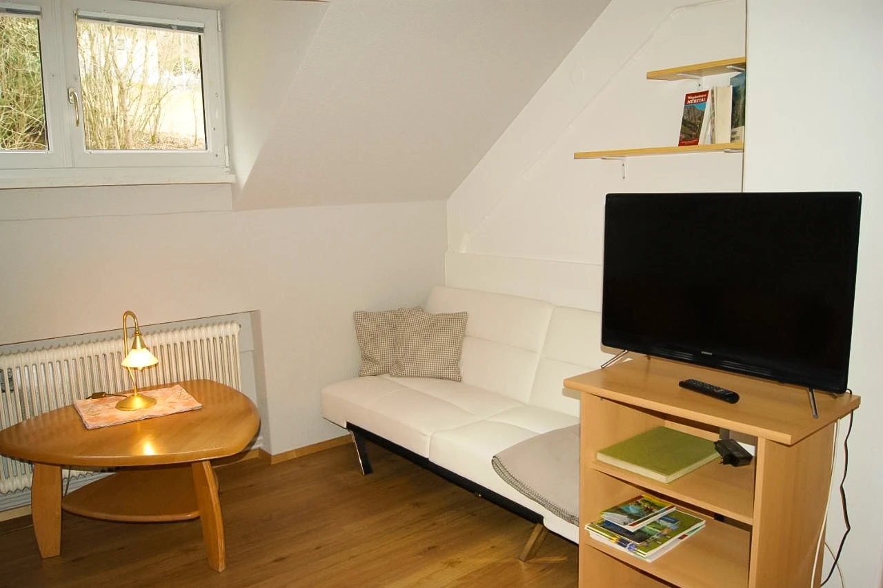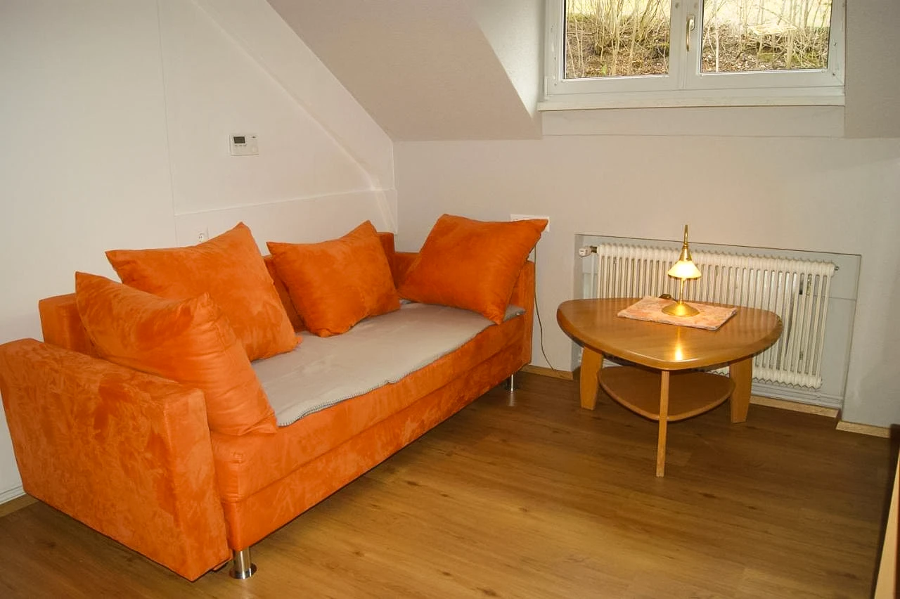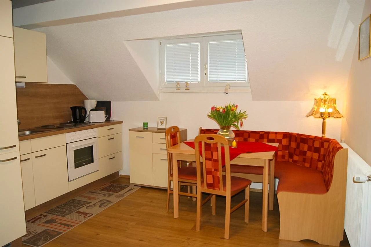 Das Apartment 3 liegt im zweiten Obergeschoss, ist ausgestattet mit einem großen Schlafzimmer, einer Wohnküche mit ausziehbarer Couch, Badezimmer und einem extra WC. Es bietet Platz für zwei Personen.